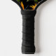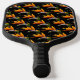 Pickleball paddle that features the photo image of an orange bloom of the tropical Bird of Paradise Plant printed in a repeating pattern on a black background. Also referred to as a Crane Flower. A stunning, floral design! Select your pickleball paddle handle colour as desired and other options.