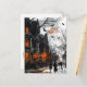 Step into a classic horror tale with this atmospheric Happy Halloween postcard. The scene depicts a cobblestone street at night, lined with ominous, glowing houses and bare trees, as shadowy figures in top hats walk through the misty air. The dark, eerie mood is perfectly captured by the flying bats and the fiery orange glow from the windows. A pumpkin centred among an intricate Happy Halloween typography greeting is shown on front and reverse. This card is perfect for sending a truly spooky greeting to friends and family. It's a great way to celebrate the holiday with a touch of gothic charm and mystery, whether you're inviting guests to a haunted house party or just sharing the spirit of the season.