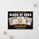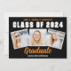 This trendy black and orange custom senior senior portrait photo collage graduate announcement card features white varsity letters for the Class of 2025 under your college or high school name. Customize with your favourite 3 graduation photographs and personalize the back with commencement details.