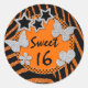 This chic and trendy customizable 1.5" round Sweet 16 birthday sticker has an orange faux glitter (PRINTED) and black zebra print animal stripes with a polka dots pattern and silver faux glitter (PRINTED) butterflies, stars, hearts, and a funky flower, with text boxes to customize how you want on it that will appeal to a modern, young girl. You can select from 2 sizes. Everything will print as you see it on your monitor, so if you need help customizing your text, or if you would like a matching sweet sixteen, Bat Mitzvaj, or Quinceanera party invitation, or if you want it in another colour combination, please email niteowlstudio@gmail.com BEFORE you order.