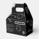 Complement your space birthday party with cute favour boxes for the little ones. The boxes are black with some spaceship elements that appear in controls. At the front, there is an illustration of a spacecraft screen with the information you can personalize. Illustrated and designe by Patricia Alvarez.