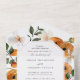 All in One Wedding invitation featuring elegant greenery and orange flower blossoms. Each card includes a perforated RSVP card that’s addressed and ready for your guests to send back in the mail. Customize with your information or click "click to customize further" to change the font style, size, colour or background colour.