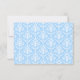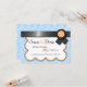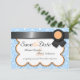 Beautiful wedding save the dates with a light blue & white damask pattern and a black ribbon design with orange at the top.