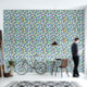 This design showcases a modern geometric pattern with circles and half-circles in shades of mint green, orange, light yellow, and white against a slate blue backdrop. It's an elegant and stylish design that embodies eclectic minimalism, perfect for artistic interior designers, decor enthusiasts, trendsetters, and fans of vintage retro or abstract digital geometric motifs. This ornate yet funky hipster pattern is versatile, and available on a variety of contemporary home decor items, making it suitable for enhancing the ambiance of spaces such as master or children's bedrooms, kitchens, nurseries, living rooms, woman caves, college dorms, condos, studios, or apartments.