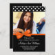 Orange Bow Polka Dots Photo Graduation Announcement Invitations. A stylish black and white polka dot pattern with a orange ribbon illustration. Perfect for a high school graduation, college graduation or graduation party! Designs are flat printed illustrations/graphics - NOT ACTUAL RIBBON. To resize and position your photo, click on the "CUSTOMIZE IT" button.