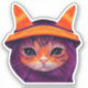 Orange Cat Purple Witch Hat Fantasy Halloween Sticker. A drawing of a cute fantasy orange cat with a purple and orange hat.