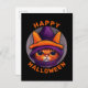 Orange Cat with Purple Witch Hat Happy Halloween Postcard. A drawing of a cute orange cat with a purple and orange hat. Happy Halloween orange text on a black background.
