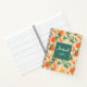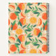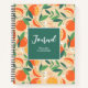 Spiral notebook with a retro vibe. A pattern composed of sliced oranges, whole oranges, green leaves and white blossoms.