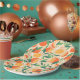 Paper plates with a retro vibe. A pattern composed of sliced oranges, whole oranges, green leaves and white blossoms.