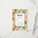 RSVP card with a retro vibe. A pattern composed of sliced oranges, whole oranges, green leaves and white blossoms.