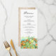 Botanical theme wedding menu features a watercolor orange tree painting with citrus leaves and blossoms. Reverse side is a vintage beige Italian style design. Artwork by KL Stock.