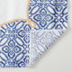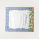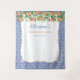 Fabric backdrop with watercolor oranges / leaves / pretty blossoms against a blue and white antique tile border. I have invitations and other stationery in the same design (please see collection).