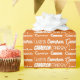 Cute orange name collage wrapping paper for a birthday party or baby shower decorated in nine different fonts spelling a custom name in white. Cute personalized kids gift wrap with fun typography in white.