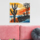 This artwork depicts a desert landscape with tall, black cacti set against a vibrant and abstract background of warm orange and cool blue watercolor washes. The cacti are illustrated in a linocut style, with bold, dark lines and detailed texture, contrasting with the softer, fluid colours of the sky. The circular, ripple-like patterns in the background suggest a sun or a heatwave effect, adding an intense sense of heat and dryness to the scene. Delicate, leafless trees and cracked desert ground details complete the arid, sparse landscape.