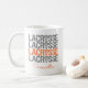 Bold letters spell out the word "LACROSSE" with the "O" replaced by a basket. The slightly distressed design makes a great personalized gift for a player, coach, team or fan. Available in red, orange, yellow, purple, green, blue, grey, black, forest green, navy, maroon, burnt orange, gold and powder blue. Matching products available.