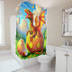 This shower curtain has an orange dinosaur on it.