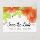 Handwritten script calligraphy and orange ethereal flowers floral fall wedding Save the Date postcard. The upper part is covered with pretty orange flowers and green leaves.