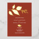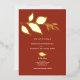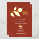 Make a bold yet elegant statement with these orange designer wedding invitations, perfect for a modern micro wedding theme or stylish autumn celebration. This simple branded wedding stationery features a border of real gold foil botanical leaves set against a rich burnt orange (terracotta) background—designed for couples who love classy luxury weddings with a seasonal twist.