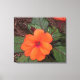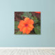 The red orange floral beauty on this Canvas Print is a New Guinea impatiens. The original photograph by ZoeSPEAK is a closeup of the flower, showing the overlapping shapes of the six brightly coloured petals, and the darker magenta centre with a little green stamen. The flower is surrounded by its dark green leaves in the garden.