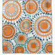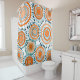 This shower curtain has a design of rings and circles in shades of orange with teal lines crossing behind them forming flowers on a field of white.