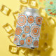 This can cooler has a design of rings and circles in shades of orange with teal lines crossing behind them forming flowers on a field of white.