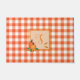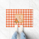 A fall doormat with an orange and white check pattern , two pumpkins and autumn leaves . Personalize it with your last name initial . Also available in black and white .