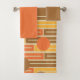 This towel set has a brown washcloth, an orange hand towel, and a bath towel with a mid-century modern design of repeating rectangles in orange, gold, and brown with circles layered on top.