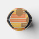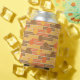 This can cooler has a mid-century modern design of repeating rectangles in orange, gold, and brown with circles layered on top.