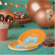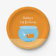 Whimsical and cute kids birthday party paper plates with an orange and blue goldfish design that has a yellow fish in a fish bowl, personalized with any name.