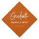 Simple math orange graduation cap topper with a background of mathematical formulas and equations. Illustrated and designed by Patricia Alvarez.