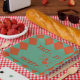 Vintage glamour checkerboard 30th birthday paper plate in green and orange. Features a hand drawn cocktail girl and whimsical script calligraphy.