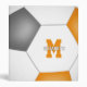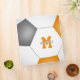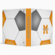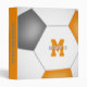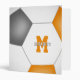 This soccer themed 3 ring binder features the image of a simple, abstractly oversized soccer ball that has orange, grey and white panels - athlete's name and monogram, varsity letter, or jersey number are customizable, as is the text on the spine of the binder and the colour of the spine - by katz_d_zynes