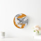 This sporty team colours volleyball themed wall clock for boys or girls features a realistic looking volleyball graphic with orange, grey and white panels and overlying clock face numerals - customize with the athlete's name in an autograph style font and jersey number in a varsity letter style font - by katz_d_zynes