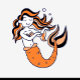 A whimsical illustration of a mermaid with flowing orange hair and a vibrant orange tail. She appears to be playfully coming her hair, surrounded by a few bubbles that add to the underwater ambiance, the lines are bold and cartoonish.