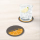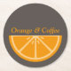 A brown coaster with an orange half-slice and customizable text. It could be used when you received friends or family at home or in a bar!