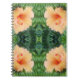The original pattern on this Notebook was made from an original photograph by HomeWare. The orange hibiscus flower we see in the photo is peeking out from among some green fern fronds in a lovely garden. The flower is in full bloom, with its ruffled edges standing out from the background of ferns. The shape of the flower is like a trumpet, curving outward, with red dots on top of yellow stems in the centre of the bloom. The photo is a closeup showing the detail in the flower petals of this peach coloured beauty.