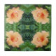 The original pattern on this small Ceramic Tile was made from an original photograph by HomeWare. The orange hibiscus flower we see in the photo is peeking out from among some green fern fronds in a lovely garden. The flower is in full bloom, with its ruffled edges standing out from the background of ferns. The shape of the flower is like a trumpet, curving outward, with red dots on top of yellow stems in the centre of the bloom. The photo is a closeup showing the detail in the flower petals of this peach coloured beauty.