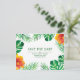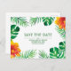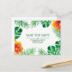 Save the Date postcard featuring tropical leaves and orange hibiscus flowers on black. Personalize this design by changing the text, text colour, and background colour. You can even add text on the reverse.