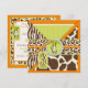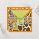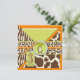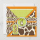 Safari prints, giraffe, zebra, and cheetah and a polka dot pattern, with monkey hanging on a vine and 3D look tags, bows, trims birthday invitation card for a three year old.