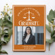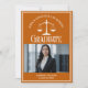 This custom orange law school graduation announcement card features white typography for a class of 2025 graduate above your student photo. Customize with your graduating year under the scales of justice and photograph for a great personalized lawyer or attorney card.