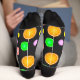 Orange, lemon, lime and grapefruit summer party pattern. Different sizes of citrus fruit with bold yellow, orange, purple pink and green colours on dark grey.