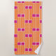 This beach towel has a mid-century modern design of orange vertical lines with pink rectangles above, repeated over the design.