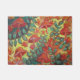 pretty orange mushroom welcome mat has red flowers, green vines and leaves on a yellow background. This nature painting makes a relaxing whimsical welcome mat.