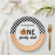 Orange One Spooky Dude Personalized Halloween 1st Birthday Party Paper Plates - Celebrate your little dude's big one in a spooky and fun way this Halloween season with this cute orange and black chequerboard retro smiley face pumpkin 1st Boo-Day Party theme for boys. Featuring black and white chequerboard and orange and white chequerboard, classic Halloween colours. A smiley face pumpkin with lightning eyes adds to the fun, retro spooky season aesthetic. Elevate your party decor with personalized birthday paper plates! All text is editable.