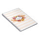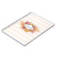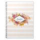 A spiral notebook with an orange and pink floral arrangement with green leaves. A diamond shaped frame layered over top with your personalized name inside.