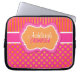 This personalized hot pink, orange, and white polka dots and stripes laptop sleeve has text boxes for you to customize with your own name, initials, business name, or other text. If you need any help customizing, please email niteowlstudio@gmail.com.