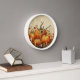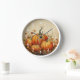 A clock with a rustic illustration with orange pumpkins and fall leaves. An autumn grunge vibe.