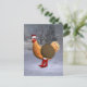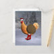 father christmas got a cute chicken as helper this year - happily marching with red boots and hat through the snow at winter time