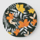 Abstract botanical leaves and orange roses create a vintage, textured elegance.