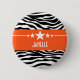 Trendy and modern Sassy Star Zebra Button featuring a chic black and white zebra print background and a bold orange border adorned with a fun star motif. This girly design may be customized with the personalized text of your choosing. Click "Customize It" to find more personalization options.